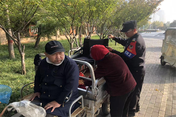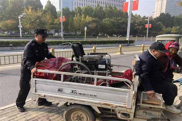 11月1日上午,特保隊(duì)員李志強(qiáng)在中院南門外發(fā)現(xiàn)有兩名信訪群眾身體不便前來(lái)中院上訪,他們年紀(jì)較大且腿腳不便,李志強(qiáng)耐心溝通了解后,主動(dòng)上前攙扶并幫助他們把輪椅裝上三輪車,協(xié)助老人推動(dòng)三輪車前去信訪大廳。