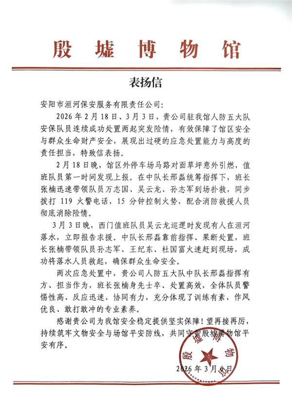 此次表揚(yáng)信,既是對人防五大隊(duì)?wèi)?yīng)急處置工作的認(rèn)可,更是對洹河保安整體服務(wù)水平的肯定。下一步,大隊(duì)將以此為動力,持續(xù)強(qiáng)化隊(duì)伍應(yīng)急能力建設(shè),筑牢文物安全與場館平安防線,為守護(hù)殷墟博物館平安有序運(yùn)行、保障人民群眾生命財產(chǎn)安全貢獻(xiàn)更大力量。